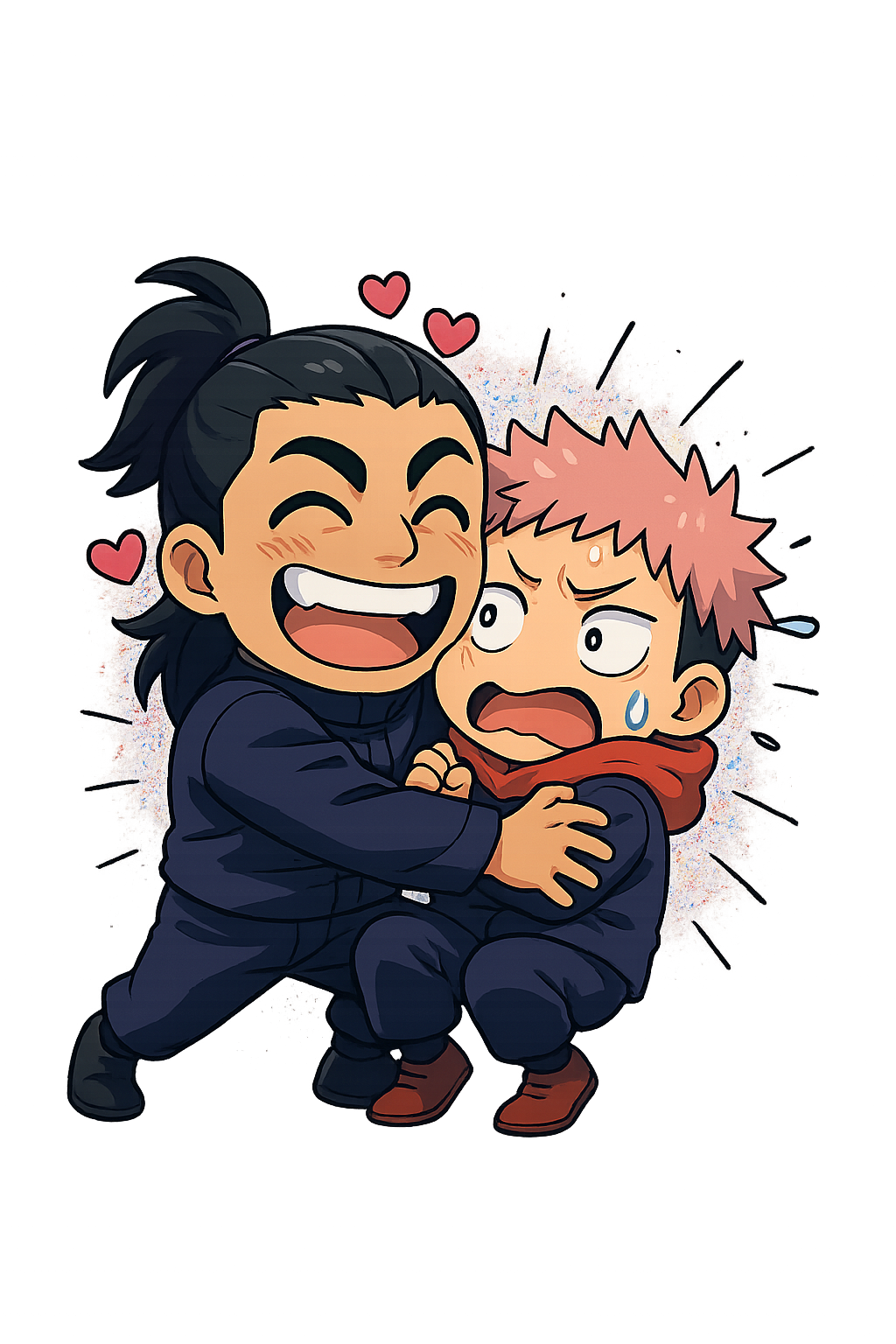 A estampa Abraço Chibi traz toda a leveza e humor de Jujutsu Kaisen em versão miniatura, mostrando Yuji Itadori sendo “sufocado de carinho” por seu amigo em um momento hilário e cheio de fofura. Uma arte divertida que mistura amizade, exagero e muito estilo para quem ama ver os personagens fora do clima de batalha.