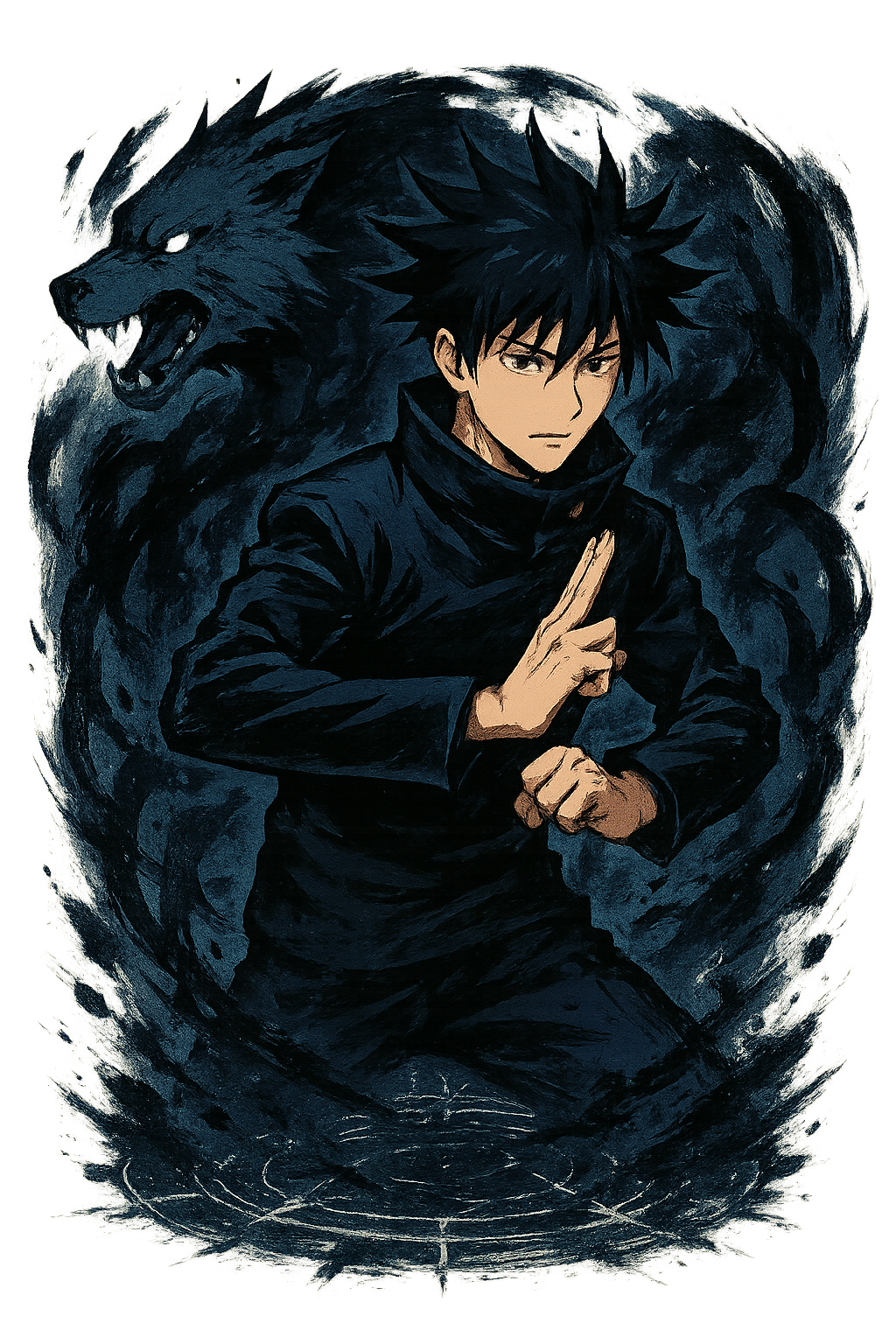 A estampa Megumi Sombras traz o herdeiro da técnica das sombras em toda sua intensidade. Cercado por sua shikigami feroz, Megumi aparece em pose de invocação, transmitindo mistério, estratégia e poder. Uma peça sombria e impactante para quem vibra com cada batalha de Jujutsu Kaisen.