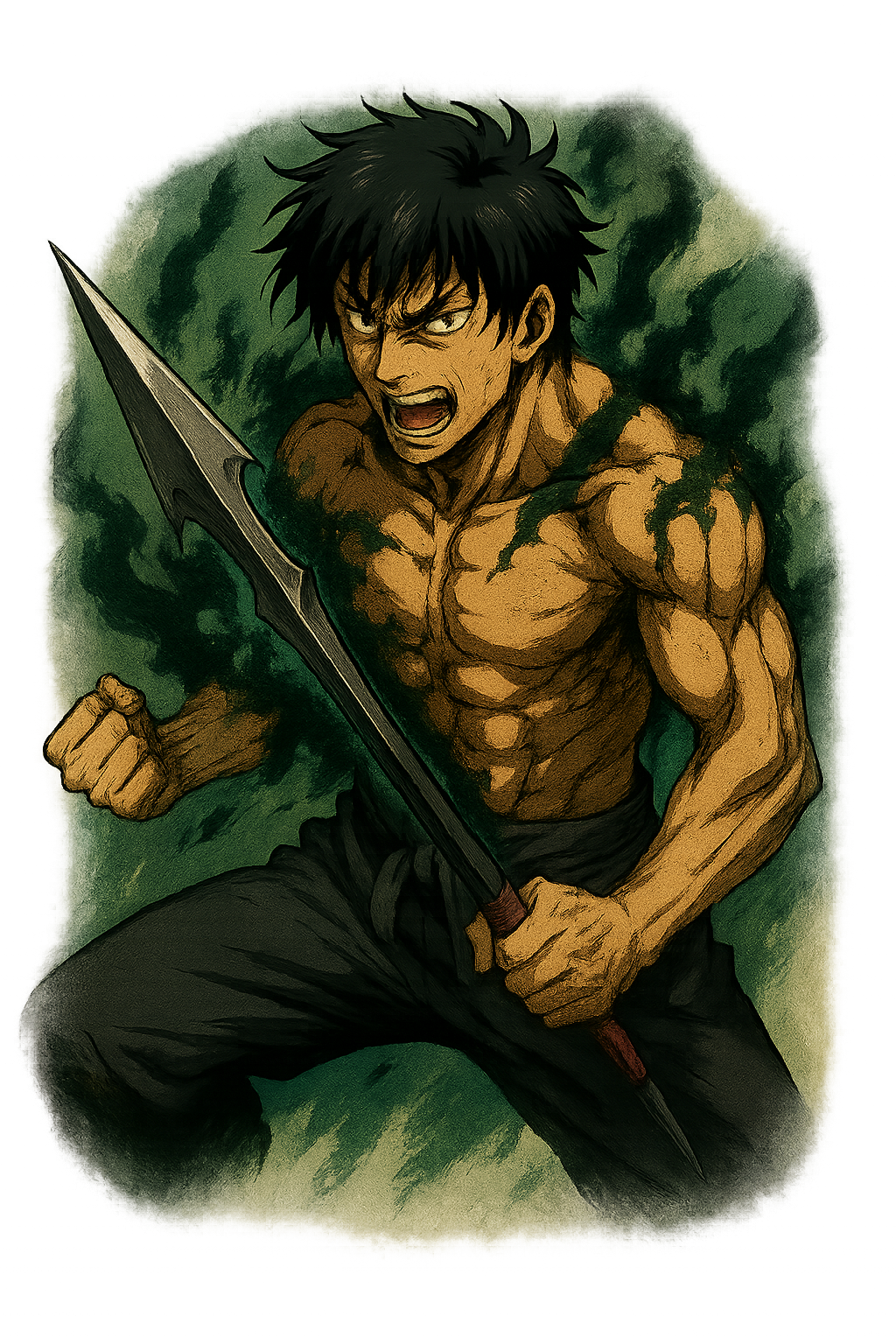 A estampa Toji Fushiguro traz o lendário assassino em sua forma mais selvagem e brutal. Com músculos definidos, aura maligna e sua icônica lança, Toji exibe a imponência e a ferocidade de quem não teme maldição alguma. Uma peça que transmite pura força bruta e instinto assassino, perfeita para os fãs que admiram sua presença devastadora em Jujutsu Kaisen.