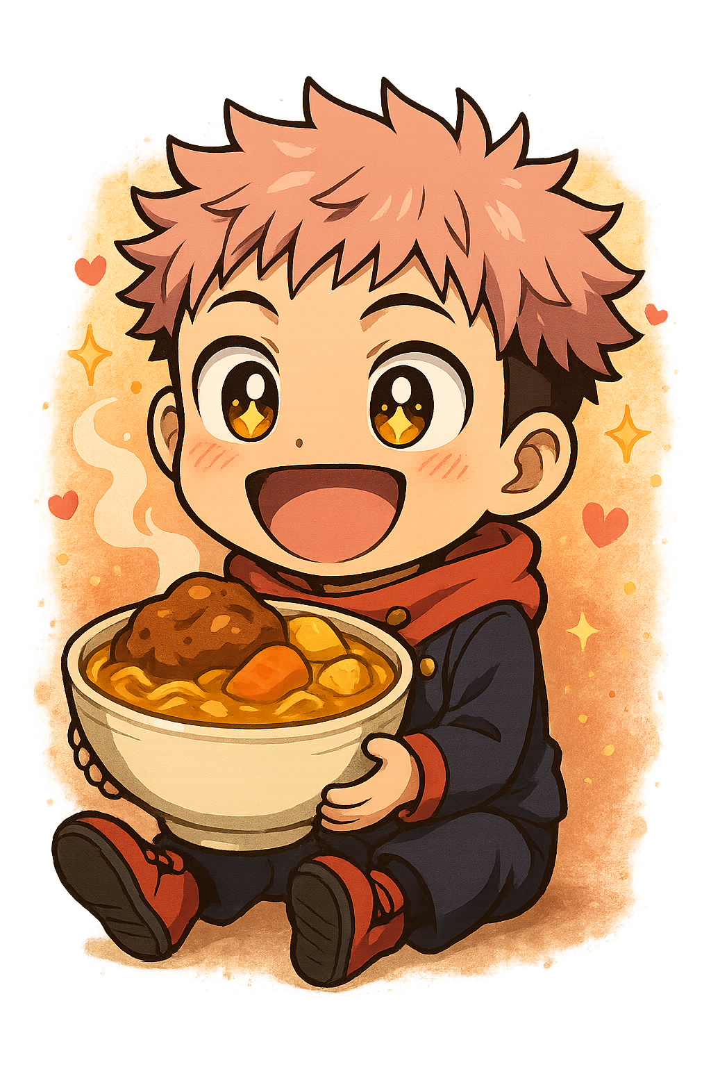 A estampa Yuji Comilão Chibi mostra o Itadori no seu momento mais fofo e divertido: feliz da vida com um prato cheio de comida! Uma cena que representa toda a energia e simplicidade do personagem, agora em uma versão chibi super carismática.