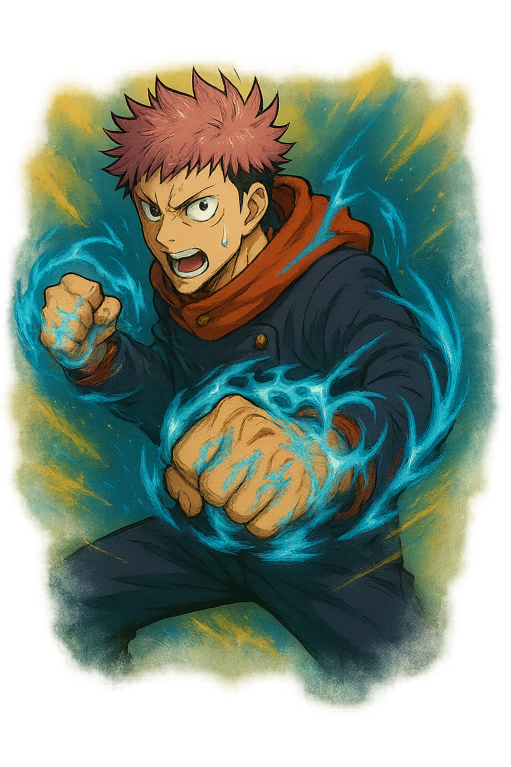A estampa Yuji Energia Oculta mostra o protagonista liberando toda a força da energia amaldiçoada, com seus punhos envoltos em aura azul incandescente. A intensidade da arte transmite a determinação feroz de Yuji Itadori em cada golpe, resultando em uma peça vibrante e cheia de impacto visual para os fãs de Jujutsu Kaisen.
