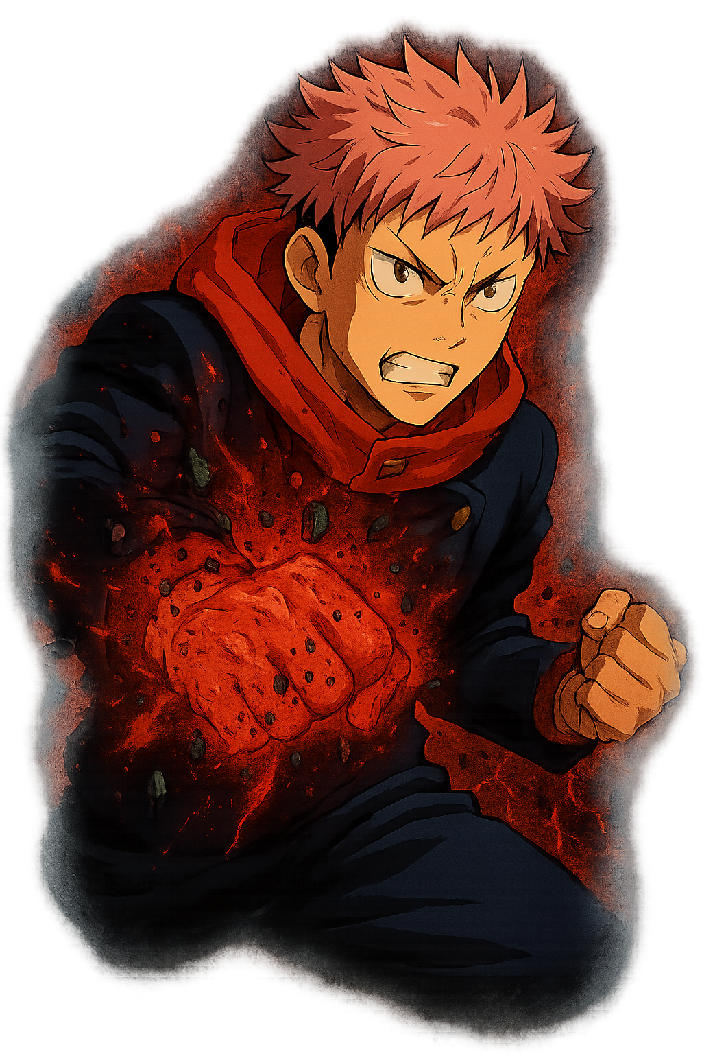 A estampa Yuji Impacto mostra Itadori em um de seus momentos mais intensos, canalizando a energia amaldiçoada em um soco devastador que explode em pura fúria vermelha. Uma arte que transmite poder bruto, velocidade e determinação, perfeita para quem vibra com as batalhas eletrizantes de Jujutsu Kaisen.